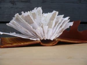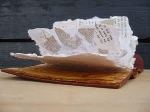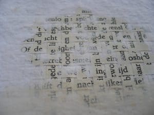 Het papier uit Bijbel, Koran en poëziebundel heb ik kunnen herscheppen tot nieuw papier, hierdoor ontstaat er een samenkomst tussen de religies met de schoonheid van poëzie als bindende kracht.